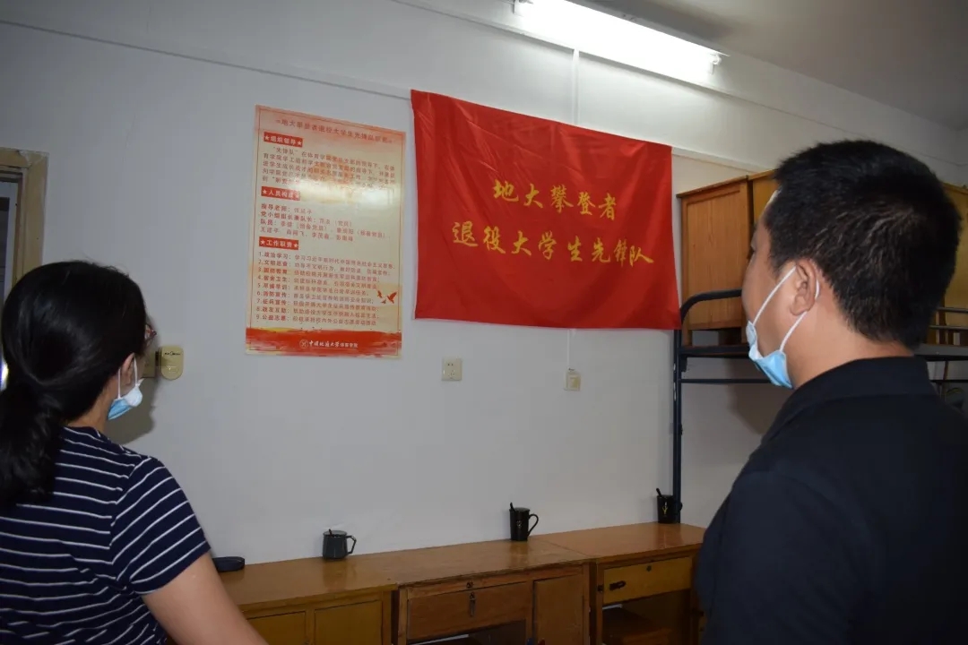 在结束了与新生们的统一见面后,院领导们又走访了一个特殊的寝室——311寝室,这间寝室的主人由7名beat365唯一官方网站退役军人和5名20级新生组成,这7名退役军人正是地大攀登者退役大学生先锋队的组成队员。