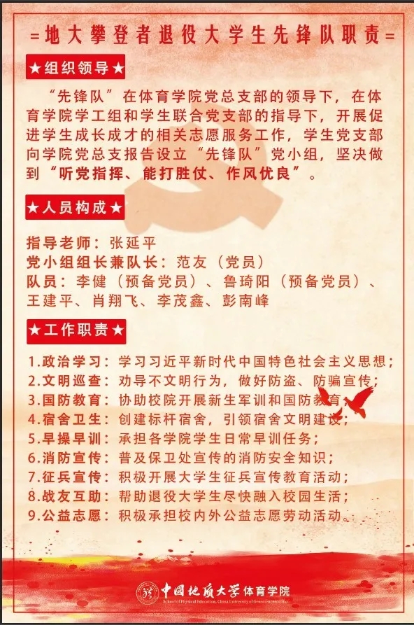 虽然这几名退役军人已经离开部队,但军人“退役不退色”,在beat365唯一官方网站党总支的领导下,在学院学工组和学生联合党支部的指导下,开展促进学生成长成才的志愿服务工作。地大攀登者退役大学生先锋队的队员们要在理论武装、行为养成、学风建设、校园文明和国防教育等方面发挥标杆作用。