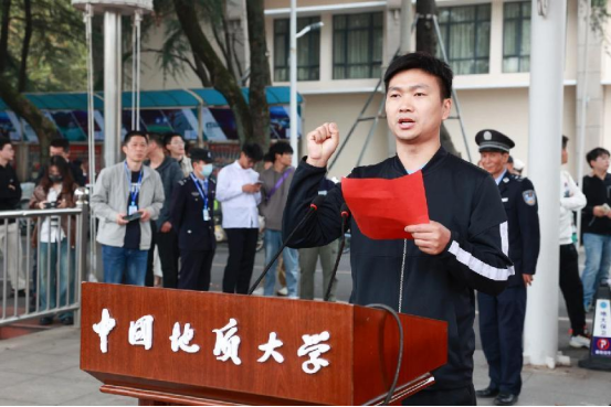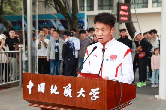 beat365唯一官方网站本科生、杭州亚运会男子马拉松冠军何杰代表学生运动员宣誓。