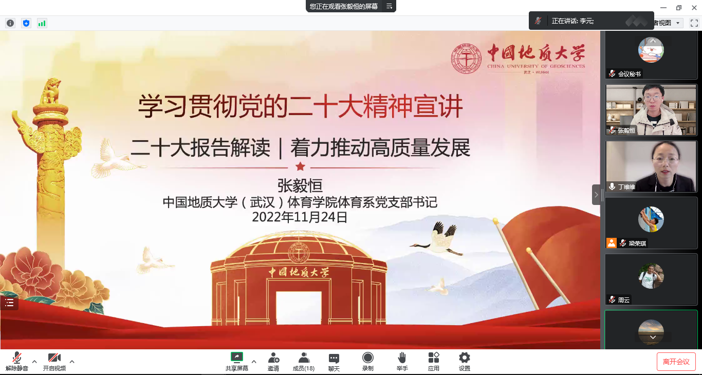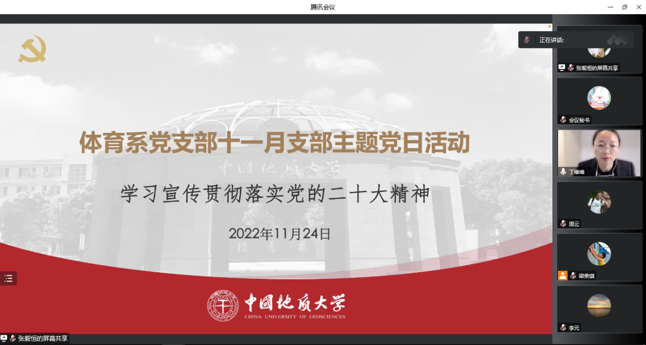 (通讯员:丁维维)11月24日下午,beat365唯一官方网站体育系党支部组织开展题为“学习宣传贯彻落实党的二十大精神”的主题党日和廉政党课活动。本次学习活动通过线上形式进行,由支部宣传委员丁维维同志主持。