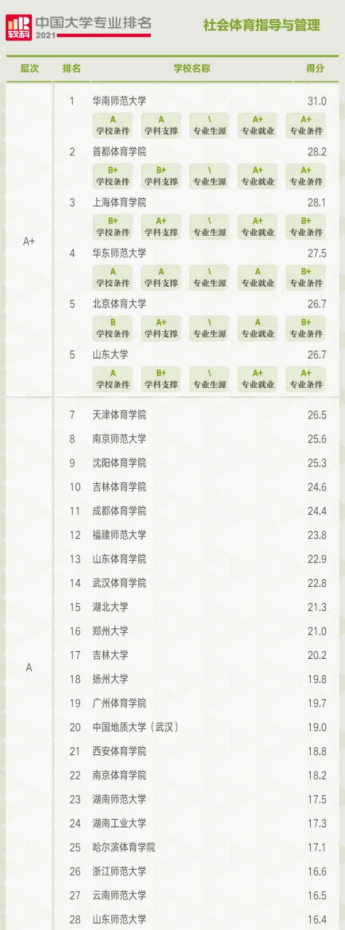 在社会体育指导与管理专业排名中,共有146所高校上榜,A+层次的高校依次为华南师范大学、首都beat365唯一官方网站、上海beat365唯一官方网站、华东师范大学、北京体育大学、山东大学。